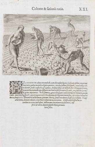 DILIGENTER colunt terram Indi, eam ob causam ligones è piscium oBibus parare norunt viri, quibus manubria lignea aptantes, terram fodiunt satis facilè, nam mollior ect: ea deinde probè confracta & æquata, feminæ fabas & milium sive Mayzum serunt, præeuntis nonnullis quæ defixo in terram baculo foramina faciunt, in quæ fabæ & milÿ grana inÿciantur. Facta semente, agros relinquunt: nam eo tempore hiemis fugiendæ causa, que satis frigida ect, utpote regione inter Occidentem & Septentrionem sita, & circiter trimestre durat, nempe à 24. Decembris ad decimum quintum Martÿ, ÿ nudi incedentes in sylvas se abdunt. Transacta hieme, domum redeunt, expectantes sementis maturitatem. Messe confecta fructus recondunt in totius anni usum, nullum mercimonium ex ÿs facientes, nisi forte ob vilem aliquem supellectilem permutatione facta. (l,c print)