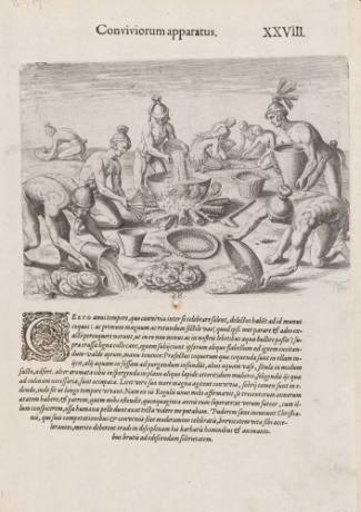 CErto anni tempore, quo convivia inter se celebrare solent, delectos habēt adid munus coquos: ac primum magnum ac rotundum fictile vas (quod ipsi-met parare & adeo exactè percoquere norunt, ut in eo non minus ac in nostris lebetibus aqua bullire poBit) supra crassa ligna collo cant, ignem subÿciunt ipsorum aliquo flabellum ad ignem excitandum valde aptum, manu tenente: Præfectus coquorum quæ coquenda sunt in ollam inÿcit, alÿ aquam in fossam ad purgandum infundūt, alius aquam vase, situlæ in modum facto, adfert. alter aromata cibis in spergenda in plano aliquo lapide atterit; dum mulieres, seligendis ÿs quæ ad culinam necessaria, sunt occupatæ. Licet vero suo more manga agitent convivia, sobrÿtamen sunt in edendo, inde fit ut longo tempore vivant. Nam ex iis Regulis unus mihi affirmavit, se trecentorum annorum ætatem habre; & patrem, quem mihi ostendit, quinquaginta annis eum superare:ut verum fatear, cum illum conspicerem, ossa humana pelle dunt ax at tecta videre me putabam. Pudorem sane incutiunt Christianis, qui suis compotationibus & conviviis sine moderamine celebratis, brevitatem vite sibi accelerantes, merito deberent tradi in disciplinam his barbaris hominibus & animantibus brutis ad ediscendam sobrietatem. (l,c print)