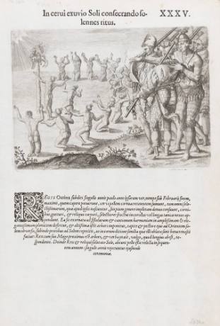 REgis Outina subditi singulis annis paulo ante ipsorum ver, nempe sub Februarÿ finem, maximi, quem capere potuerunt, cervi pellem cornua retinentem sumunt, eam omni selectissimarum, que apud ipsos nascuntur, stirpium genere impletam denuo consuunt, cornibus, gutturi, & reliquo corpori, selectiores fructus in corollas vel long as tenias nexos appendunt. Ea sic exornata ad fistularum & cantionum harmoniam in ampliBimam & elegantiBimam planiciem defertur, & altiBimæistîc arbori imponitur, capite & pectore ejus ad Orientem solem obversis, subinde precibus ad Solem repetitis, ut in eorum ditione similia quæ illi oblata sunt bonarenasci faciat: Rex cum suo Mago proximus ect arbori, & verba præit, vulgo, quod longius abest, respondente. Deinde Rex & reliqui salutato Sole, abeunt pelle istic relictain sequentem annum: singulis annis repetuntur ejusmodi ceremoniæ. (l,c print)