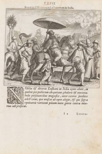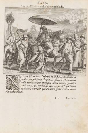 NObiles & ditiores Lufitani in India equos alunt, in quibus per publicum obequitant, phaleris & tintinnabulis personatibus magnifice, inter cateros satellites adest unus, qui muscas ab equo abigat, & qui fupra equitantis verticem pileum more gentis contra iniurias cali preferat. (l,c print)